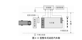 圖 4 是 C 型整車式動態(tài)地磅布局, 采用單個車輛分離設備,上秤端布置了一套軸重秤(軸組重稱),下秤端采用下秤觸發(fā)器。 從形式上看,但通過上秤端車輛分離器和上秤端軸重秤的配合,可以在車輛駛上秤臺的過程中計算車輛的軸數(shù),通過下秤觸發(fā)器計算車輛駛離秤臺的軸數(shù), 即可判斷車輛是否駛離秤臺,因此該秤臺也可用于“一車一桿”模式;不同于 A、B型,C 型整車式動態(tài)地磅由于具有軸或軸組稱量的能力,可通過軸或軸組稱量的方式實現(xiàn)“連續(xù)過車”模式。