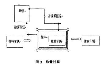 地磅計(jì)量系統(tǒng)安裝在酒鋼的可回收資源利 用場(chǎng)地內(nèi),衡器最大可承重200t,安裝在距值班室 東側(cè)50m處項(xiàng)目的稱量軟件上實(shí)時(shí)顯示數(shù)據(jù)。通過(guò) 視頻監(jiān)控,音頻視頻實(shí)時(shí)傳輸技術(shù)對(duì)計(jì)量過(guò)程全程 監(jiān)督利用網(wǎng)絡(luò)技術(shù)實(shí)現(xiàn)了計(jì)量稱重?cái)?shù)據(jù)自動(dòng)上傳。 當(dāng)載重汽車稱量時(shí)首先告知磅房值班員,并取得相 關(guān)票據(jù),安裝在現(xiàn)場(chǎng)值班室前端的攝像機(jī)及安裝在 秤體兩端的紅外光電傳感器開(kāi)始工作,此時(shí)值班員 需觀察視頻監(jiān)控主機(jī)和磅房稱量系統(tǒng)界面,當(dāng)載重 汽車確實(shí)完全進(jìn)人衡器且前后紅外報(bào)警裝置均不 被遮擋,待衡器達(dá)到穩(wěn)定狀態(tài)后,即計(jì)量數(shù)據(jù)不隨 車輛慣性發(fā)生浮動(dòng)后數(shù)據(jù)自動(dòng)存人磅房稱重系統(tǒng)。 當(dāng)車輛處于非正常位置時(shí),值班員可在磅房?jī)?nèi)通過(guò) 圖像和光電傳感器進(jìn)行識(shí)別,用話筒和設(shè)在現(xiàn)場(chǎng)的 揚(yáng)聲器提醒駕駛員及時(shí)調(diào)整車輛位置,直到數(shù)據(jù)自 動(dòng)上傳為止。稱重過(guò)程如圖3所示。